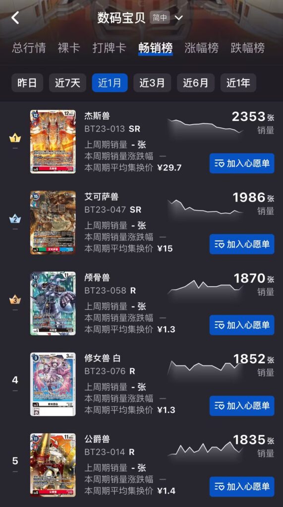 BT-23収録の「バタフライモン」や「ジェスモン」などの強力カードが環境を牽引しており、新弾の市場効果が明確に表れた形です。