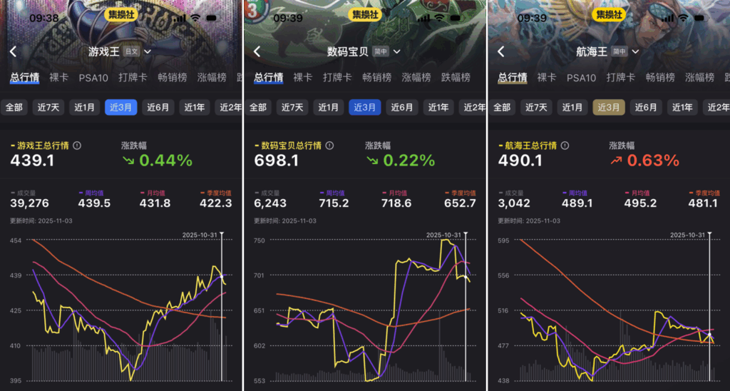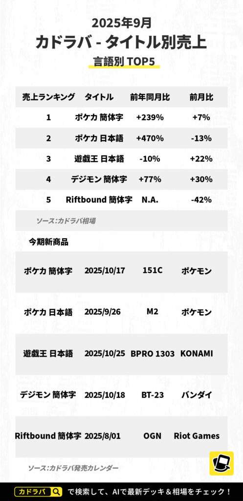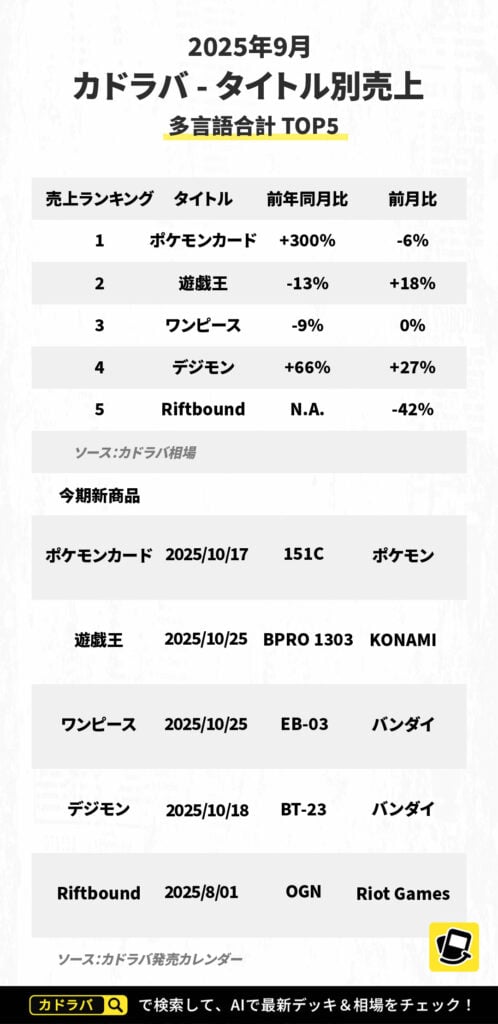 一方で、遊戯王・デジモン・ワンピースなどのタイトルは回復の兆しを見せ、10月の取引指数は小幅ながら上昇しました。
