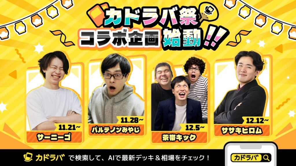 「カドラバ祭」は、“みんなのトレカ愛を広げる”をテーマに、選手・プレイヤー・コレクターなど異なる立場で活躍する人気クリエイターが、トレカの魅力をそれぞれの視点から発信するコラボレーション企画です。今回はポケカ文化を支える4人のクリエイターとコラボし、11月中旬から12月末にかけて、毎週新しいコンテンツやキャンペーンが公開されます。「カドラバ祭」に参加するポケカクリエイターは今後も順次発表いたします。