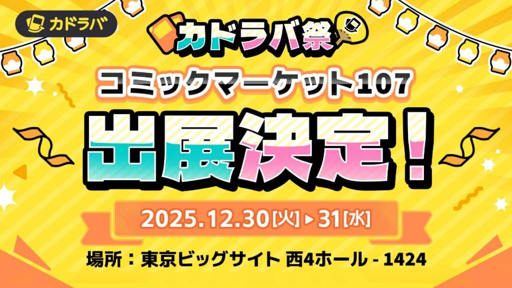 また「カドラバ祭」の一環として、2025年12月30日〜31日に開催される「コミックマーケット107」への企業ブース出展が決定しました。ブースでは「カドラバ」に関する体験コンテンツや限定キャンペーンなどを予定しております。デジタルとリアルの両面から、トレカをこよなく愛するプレイヤーが互いにつながり、情報や情熱を共有できる場を創出します。